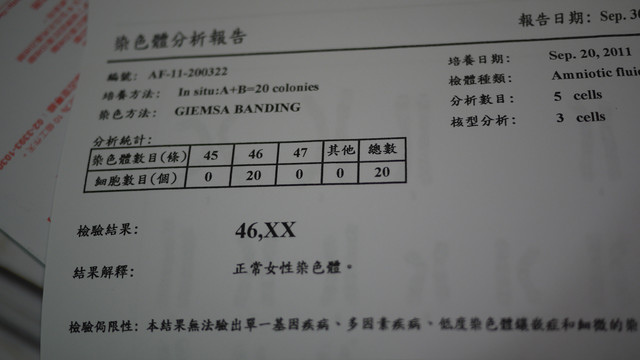 不過隔天檢驗報告就寄到家裡了,報告上染色體清清楚楚就是XX ,所以是個健康的女兒